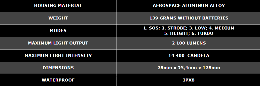 Construction of a lightweight and compact flashlight that weighs 139g and measures 28mm x 25.4mm x 128mm, designed for everyday carry as well as for mounting on weapons. Despite its small size, the flashlight in the highest mode provides a light output of 2 100 lumens with an intensity of 14 400 candelas.